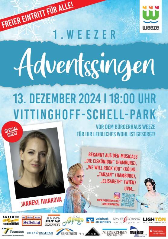Am 13. Dezember 2024 findet im Vittinghoff-Schell-Park das "1. Weezer Adventssingen" statt, eine Veranstaltung, die im Kreis Kleve Premiere feiert, da es diese Veranstaltung in dieser speziellen Form hier noch nicht gegeben hat.