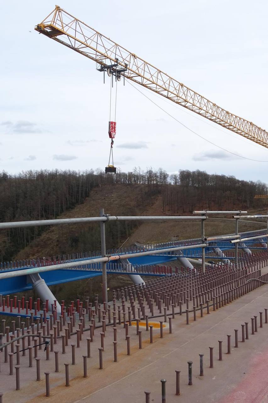 Wissing war ins Sauerland gekommen, um sich ein Bild vom Baustellenfortschritt zu machen: Seit mehreren Monaten wird der stählerne Überbau von beiden Seiten des Tales Stück für Stück über die Pfeiler geschoben. Nun sind beide Teile nur noch wenige Meter voneinander entfernt und sollen zeitnah miteinander verbunden werden, wie es am Dienstag von der Autobahn GmbH hieß. Der Brückenbauer spricht in so einem Fall von der "Stahlhochzeit".