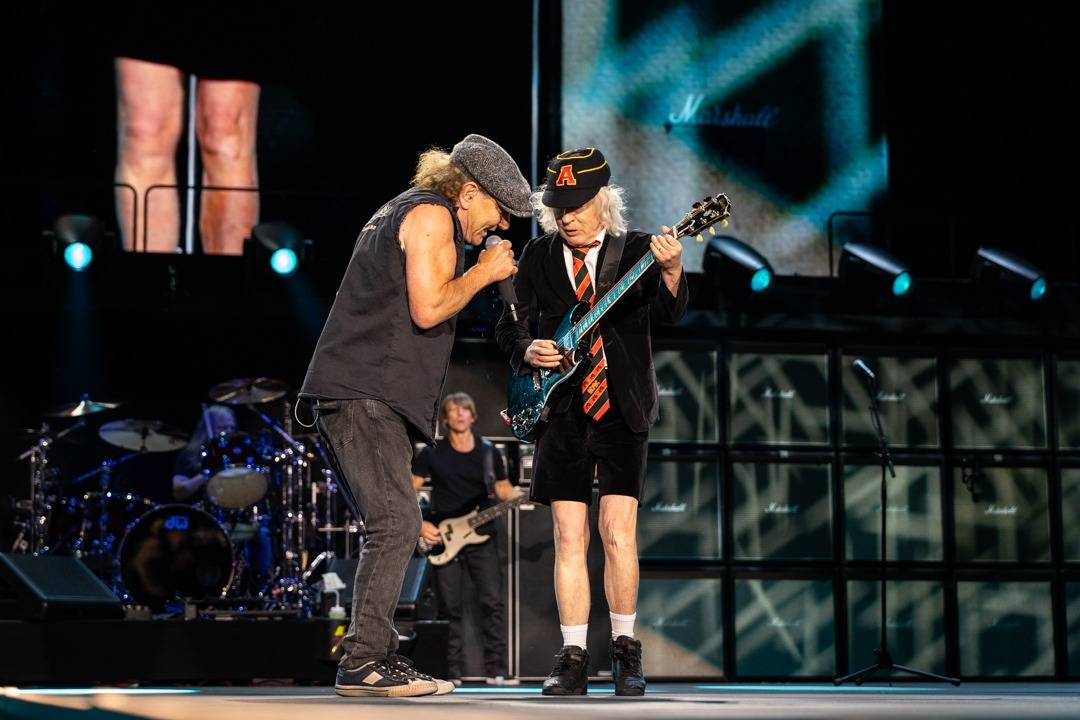 AC/DC Live in Düsseldorf 08.07.2025 Merkur Spielarena Brian Johnson Angus Young nebeneinander auf der Bühne