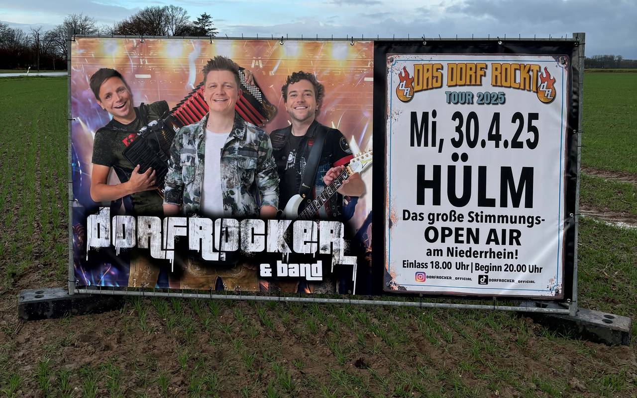 Am 30.04.25 findet auf dem ehemaligen Sportplatz in Goch-Hülm eine Open-Air-Party mit den Dorfrockern statt. Nachdem Hülm den zweiten Platz beim Dorfrocker-Wettbewerb gemacht hatte und die Rückmeldungen so positiv waren, haben sich die "Eventfreunde Hülm" gegründet, um ein Konzert zu organisieren. Tickets gibt es im Vorverkauf für 18 €. Zu den Vorverkaufsstellen kommt ihr hier oder ihr schickt eine E-Mail an tickets-huelm@web.de. Kinder bis 12 Jahre haben freien Eintritt. Es wird keine Abendkasse geben.
