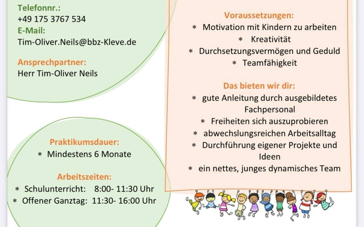 Der offene Ganztag der Gelderland-Schule sucht Bundesfreiwillige für Aufgaben wie Unterstützung beim Mittagessen und Begleitung der Hausaufgabenzeit. Freiwillige können auch im Unterricht hospitieren, abgestimmt mit der Schulleitung. Interessierte wenden sich an Herrn Tim Oliver Neils unter 02831-1341178 oder tim-oliver.neils@bbz-kleve.de.