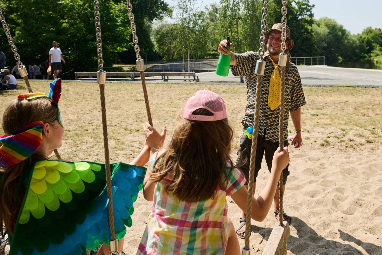 Ein Mann bespritzt seine Kinder mit Wasser, während diese auf Schaukeln sitzen. Zum Sommeranfang herrschen hochsommerliche Tempertauren.