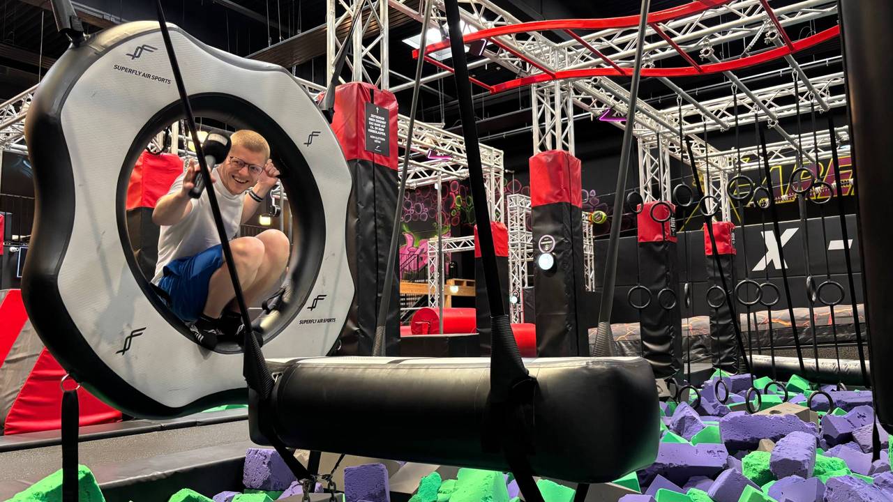 Der Boden ist Lava. Nach diesem Kindermotto können sich Jung und Alt bei Superfly unter anderem an einem Hindernis-Parcour im "Ninja Warrior"-Stil ausprobieren. Unser Reporter Sascha Fassbender hat es versucht.