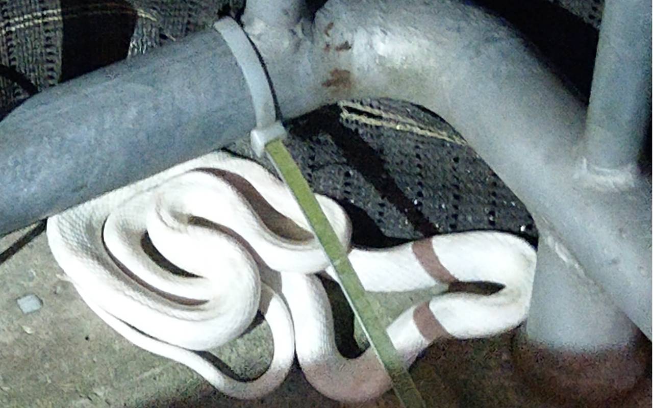 Die Feuerwehr konnte das Tier mit Hilfe eines Schlangenhakens einfangen und dem Terrazoo in Rheinberg übergeben. Nach Rücksprache mit einem Schlangenexperten konnte das Tier als "Weisse Kornnatter" identifiziert werden, die für Menschen ungefährlich ist. Ein Besitzer konnte nicht ausgemacht werden.