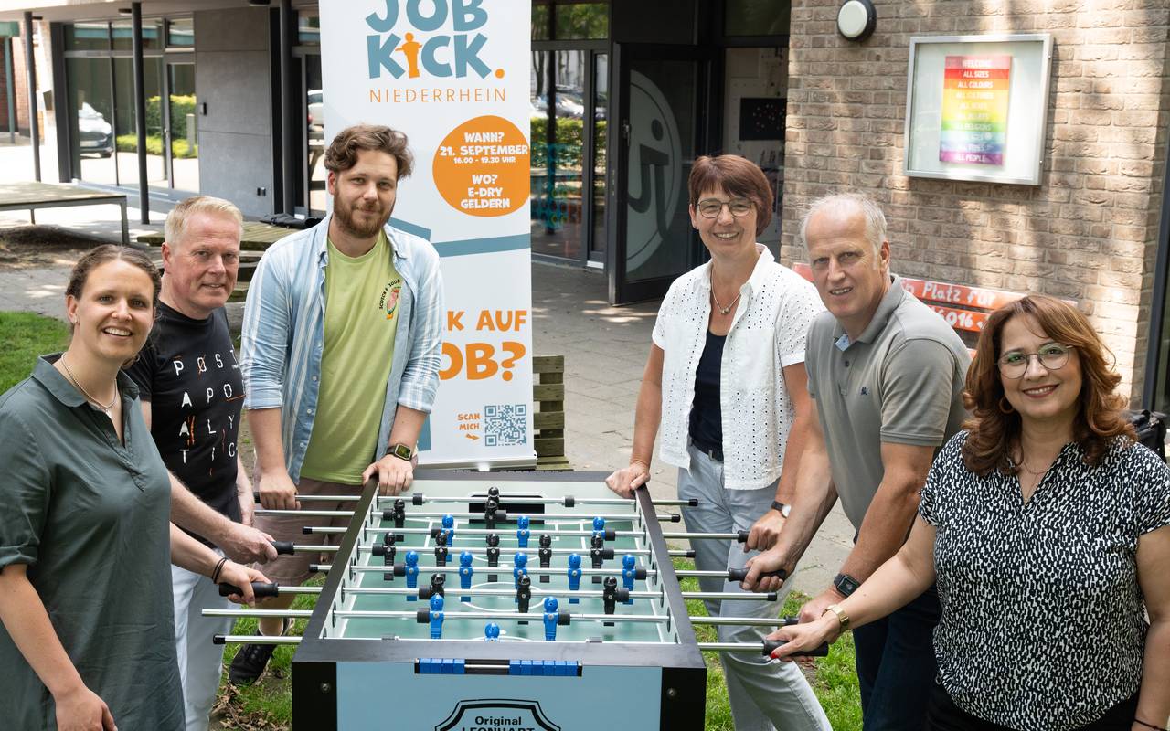 Am Samstag (21.09) findet im E-Dry in Geldern das Event "Jobkick Niederrhein" statt, bei dem Schüler ab der 8. Klasse Unternehmen am Kickertisch kennenlernen können. Über 40 Firmen aus verschiedenen Branchen sind dabei, und es gibt die Möglichkeit, sich online für Spiele-Slots zu registrieren. Weitere Infos zur Anmeldung findet ihr hier.