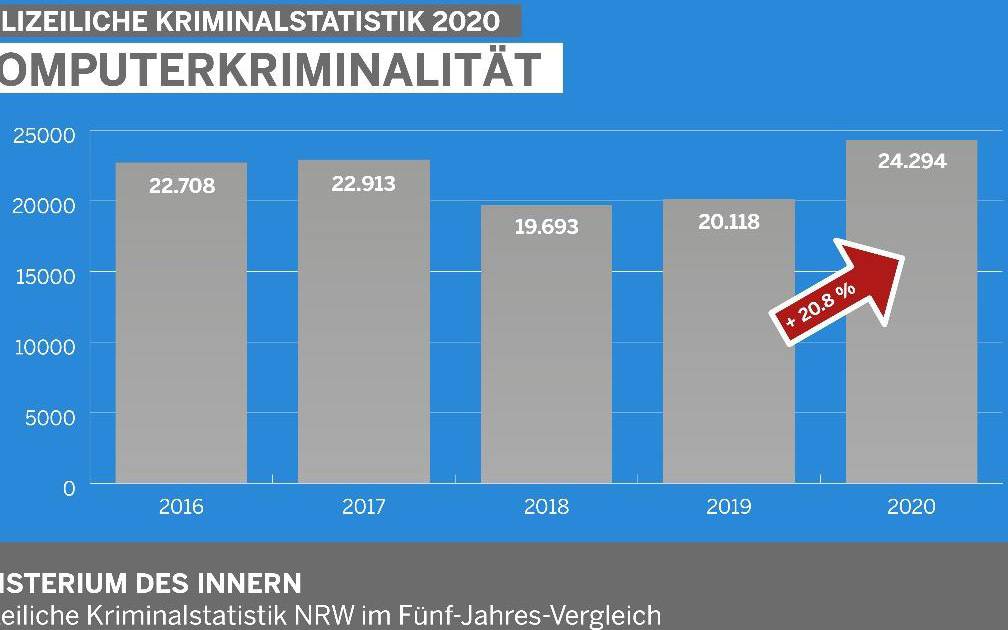 Einen echten Anstieg gibt es in der Cyberkriminalität - um fast 21 Prozent. Innenminister Reul sagt, dass die Zahl der Fakeshops im Netz massiv gestiegen sei.