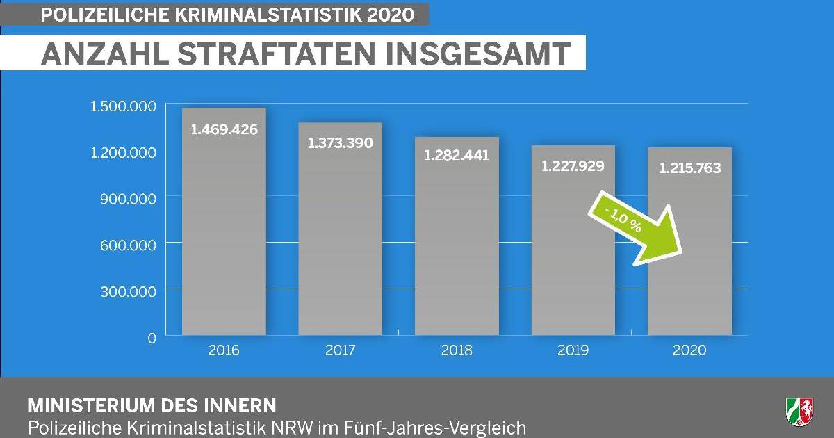 NRW-Innenminister Reul hat allen Grund sich zu freuen: In Nordrhein-Westfalen ist die Kriminalität im vergangenen Jahr zurückgegangen. Die Gesamtzahl aller registrierten Straftaten in der Statistik der Polizei ging im vergangenen Jahr um ein Prozent zurück. Es gab insgesamt 1.216.000 Straftaten.