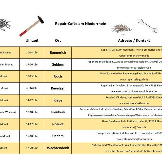 Veranstaltungen Reparieren anstatt Wegwerfen!Die Repair-Cafés am Niederrhein bringen versierte (Hobby) Handwerker und Besitzer reparierfähiger Gegenstände (z.B.